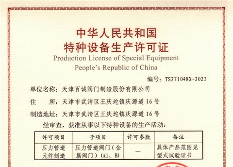 百诚阀门行业顶级资质:国家A1级特种设备制造许可证,具备全品类阀门的制造和维修能力。